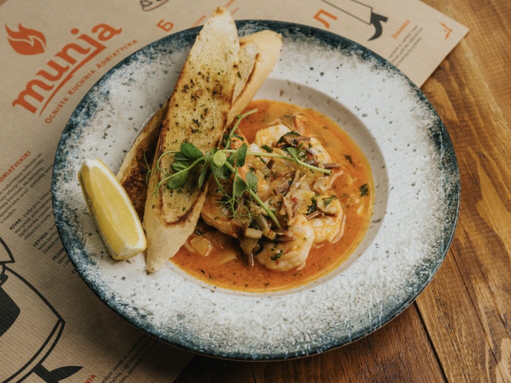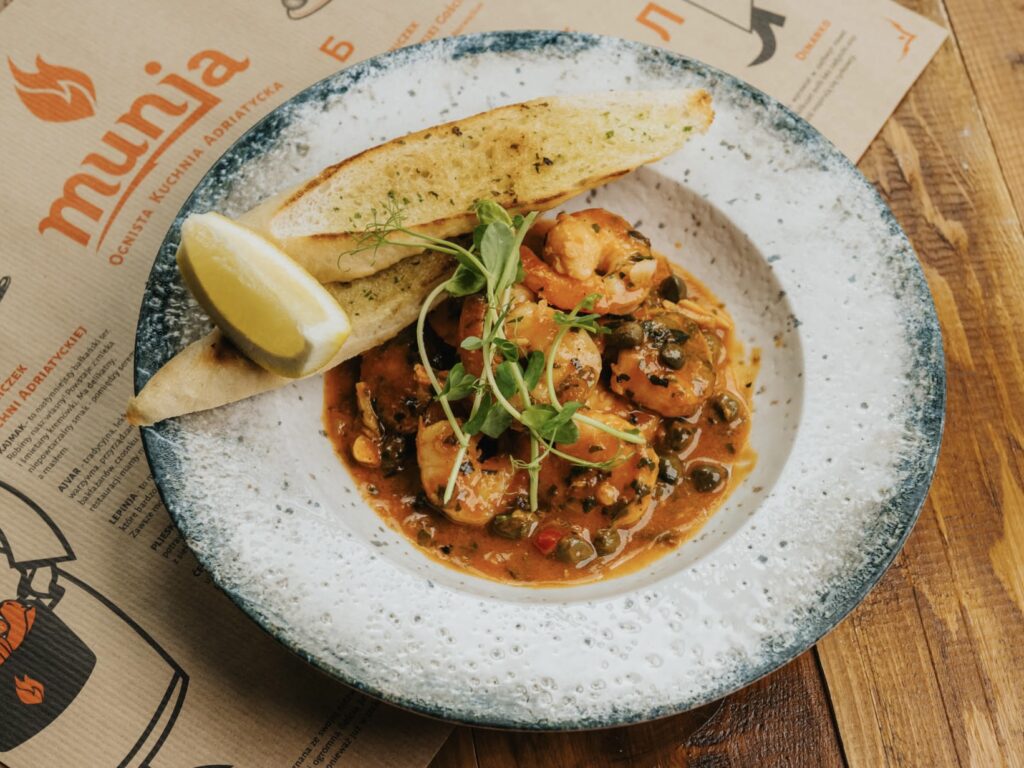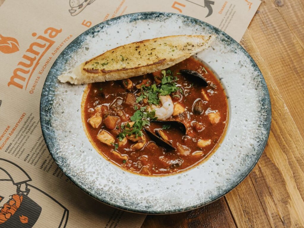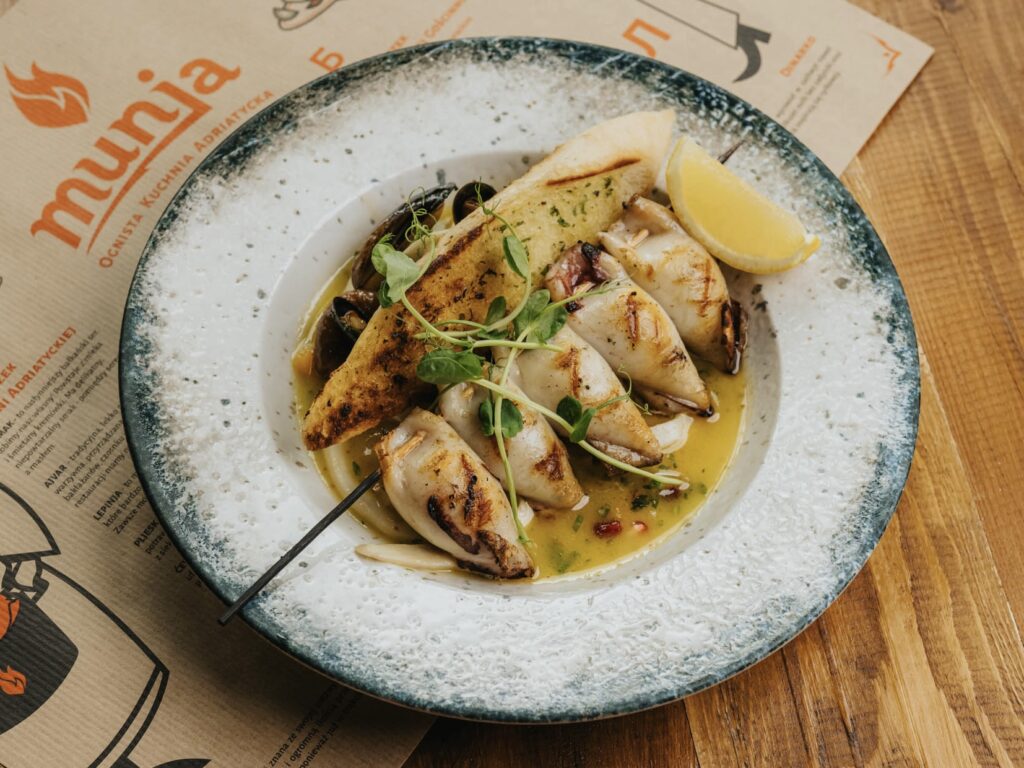Dorada z rusztu, chrupiące kalmary, mule w sosie śmietanowym z gorgonzolą, mule w sosie winno-maślanym z czosnkiem, selerem naciowym i natką pietruszki, grillowane krewetki, kalmary faszerowane risotto, wędzonym serem i szynką Pršut, macki kałamarnicy, pieczone ziemniaczki w sosie maślanym z cebulą, czosnkiem i natką pietruszki, sałata šopska i krucha sałata sezonowa z sosem vinaigrette, chimichurri, grillowane warzywa, chilli, kajmak, ajvar, urnebes