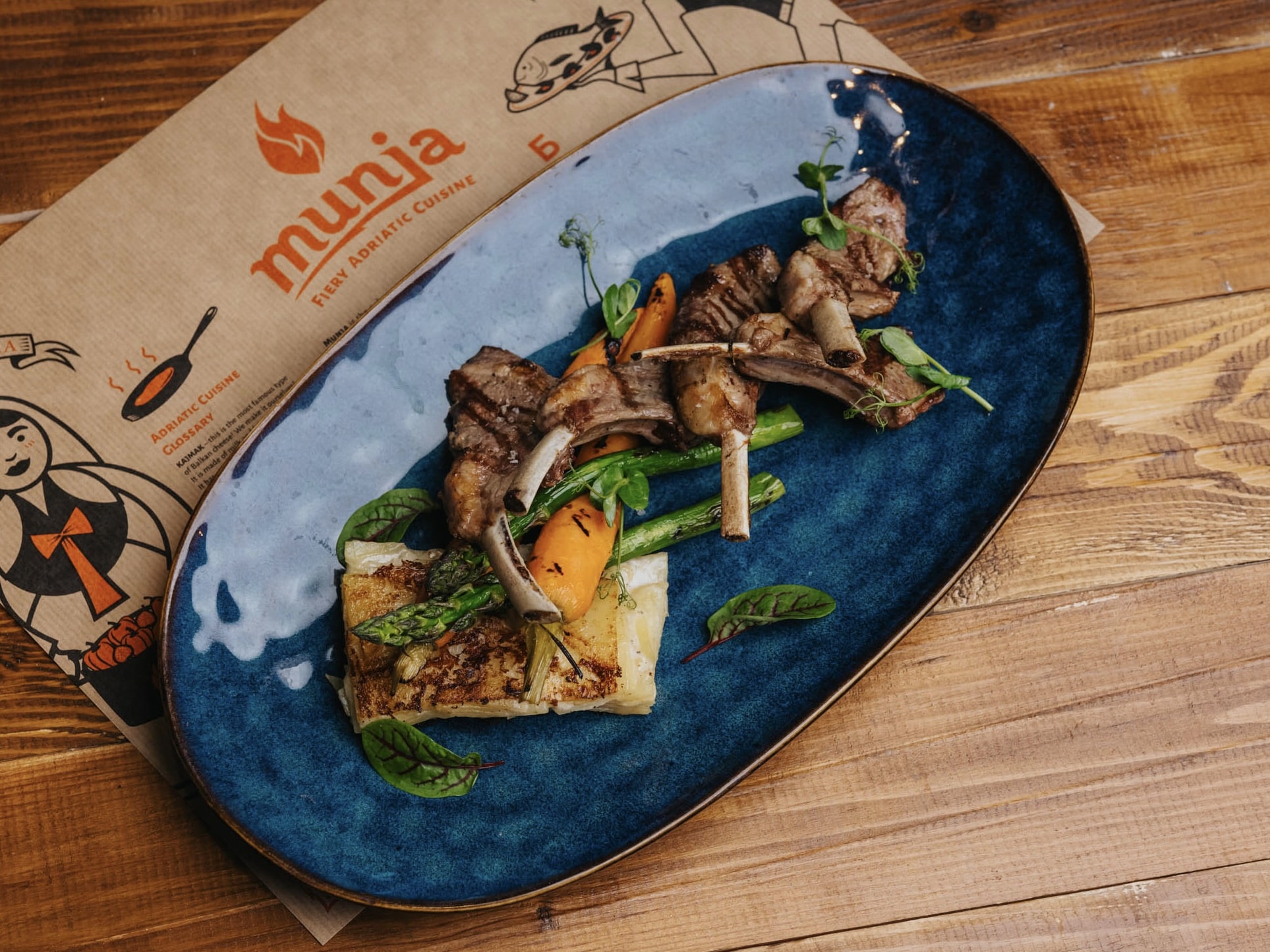 Krewetki z szynką dojrzewającą Pršut, figami karmelizowanymi, chilli, białym winem, rakiją, cebulą, czosnkiem i grzankami czosnkowymi