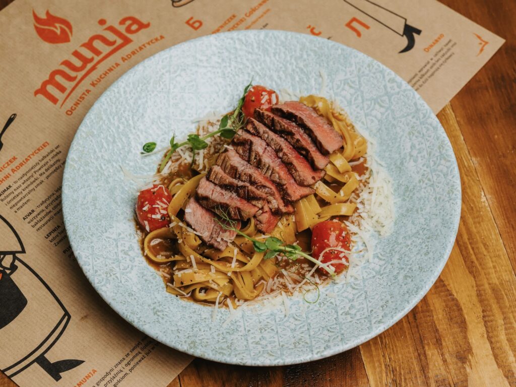 Tagliatelle, maślany sos demi glace, polędwica wołowa, pomidorki cherry, sól truflowa, parmezan