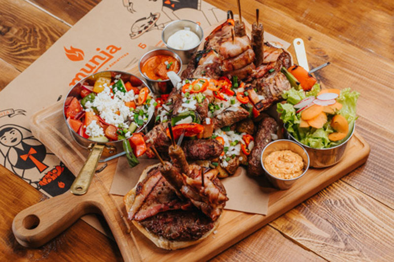 Żurek na wywarze jagnięco-wieprzowym z kiełbaskami jagnięcymi, kurkami, puree ajvarowym, jajkiem i chipsem z boczku