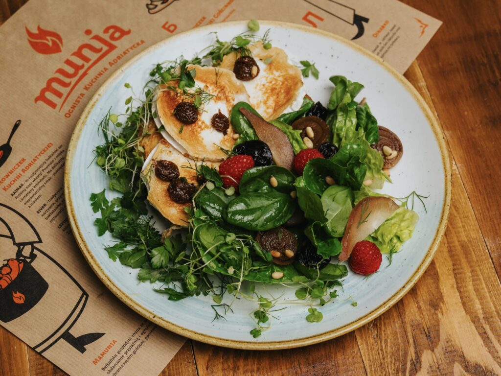 Sałata rzymska, szpinak, grillowany dojrzewający ser kozi, chałka z masłem tymiankowym, konfitowane śliwki, gruszka w winie, truflowy vinaigrette, chutney figowy, balsamiczna cebulka, świeże zioła